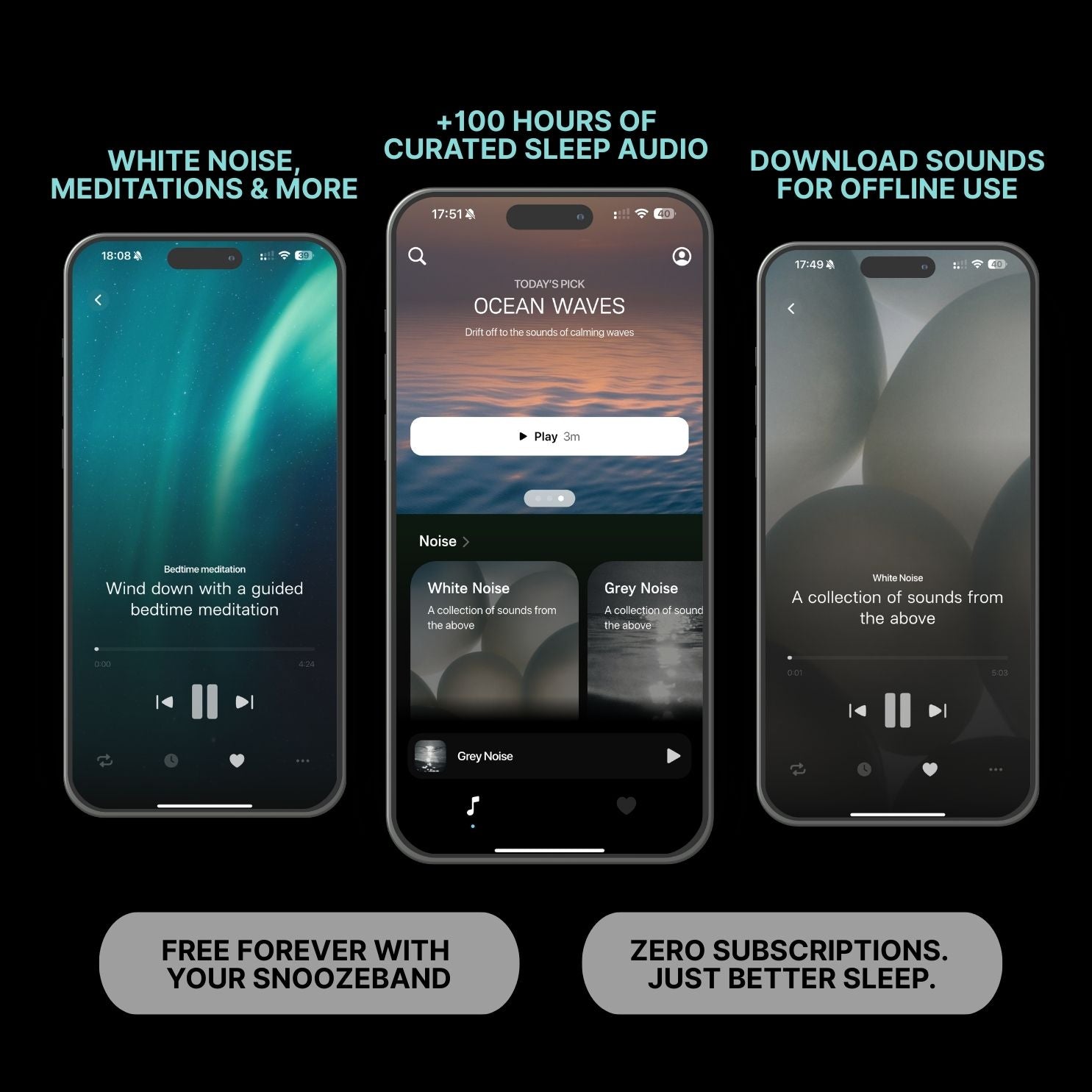 Enjoy full access to the app’s sleep sounds, meditations, and offline features - completely free with your Snoozeband. No subscriptions. No hidden fees.