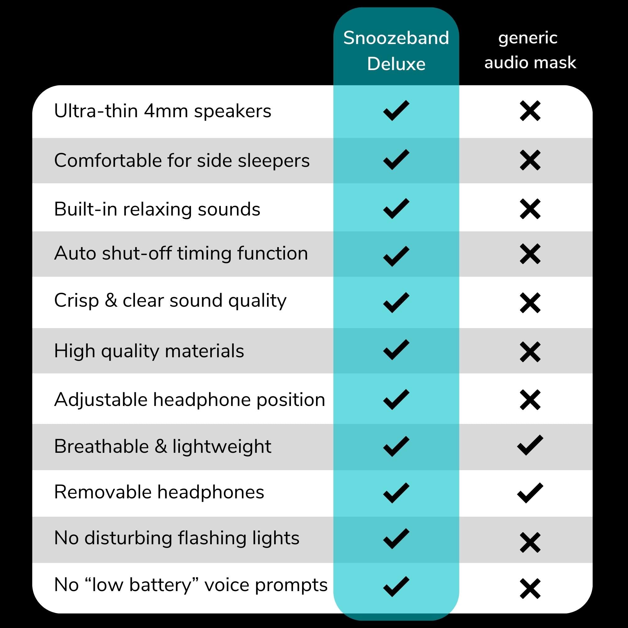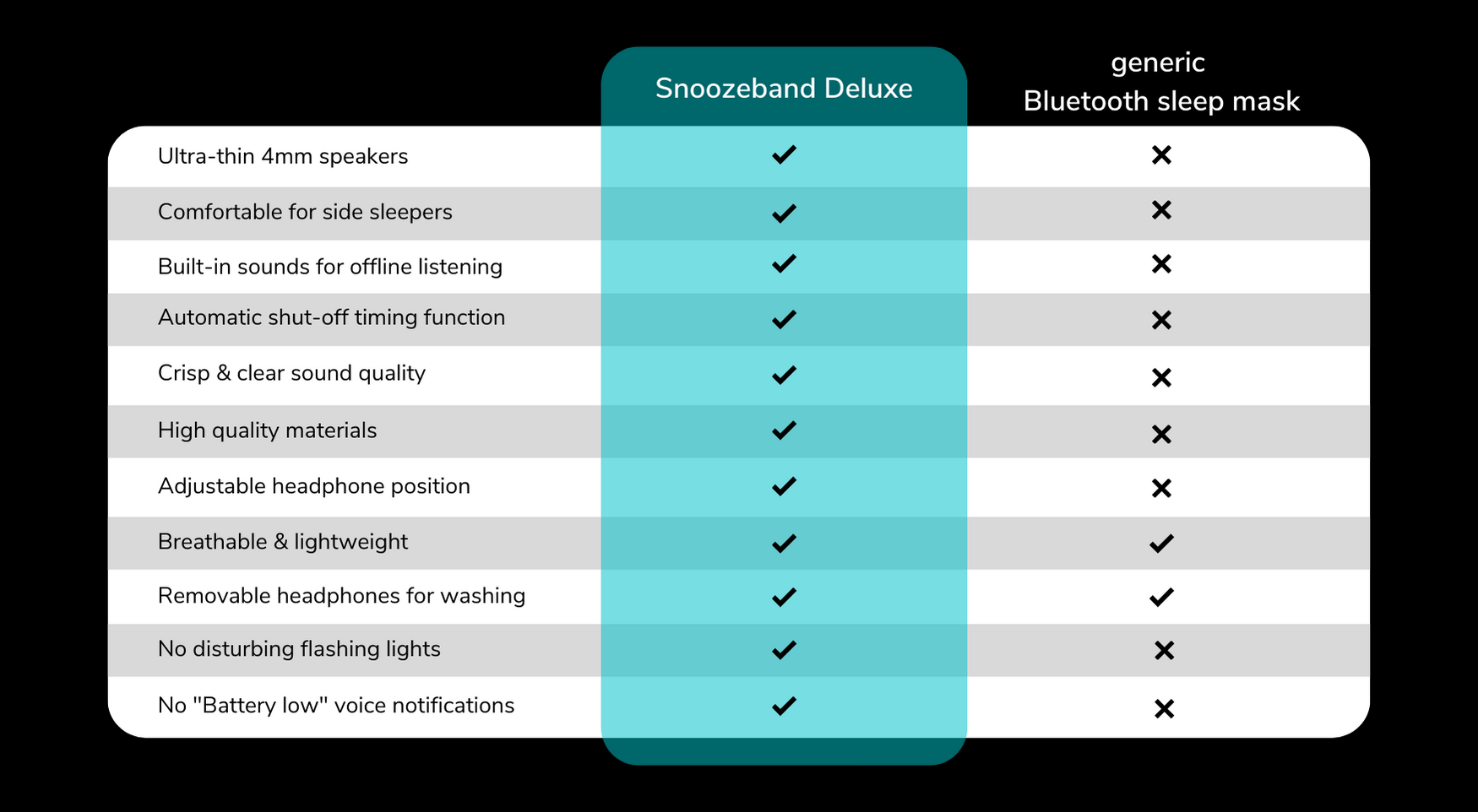 You no longer need a device or Bluetooth connection to enjoy relaxing audio. Snoozeband Deluxe features built-in sounds, ranging from gentle white noise to nature sounds. And the best part? You can effortlessly switch between the Bluetooth and White Noise mode, so your favorite sounds are always at your fingertips, no matter the situation.